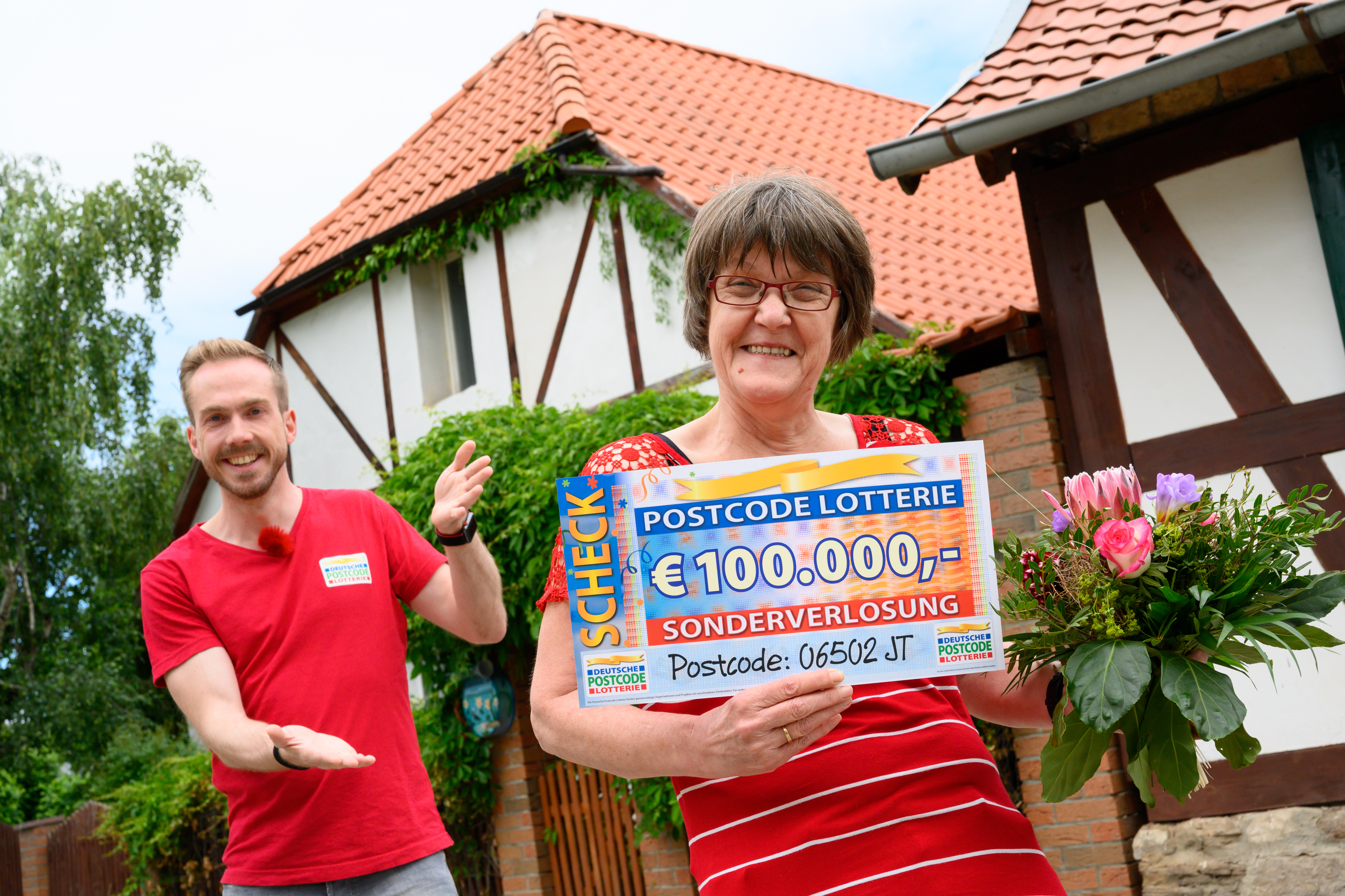 Dank des gezogenen Postcodes 06502 JT freut sich eine Altenpflegerin aus Thale in Sachsen-Anhalt über sagenhafte 100.000 Euro. Sie ist eine der ersten Gewinnerinnen bei der 1-Million-Euro-Sonderverlosung der Deutschen Postcode Lotterie im Juni – und den Freudentränen nah.