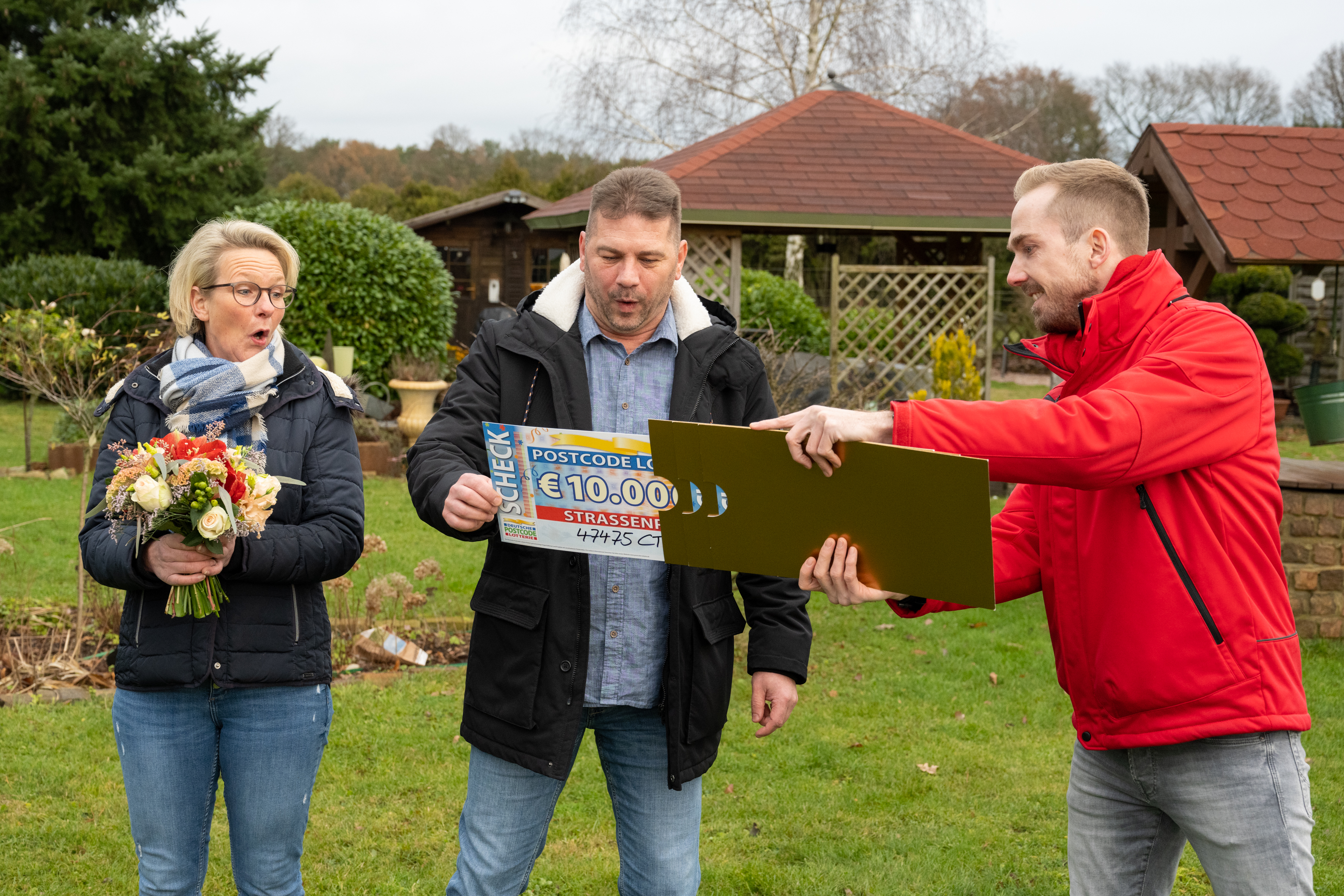 Eigentlich erwartet Marc* einen Tag wie jeden anderen. „Wetter okay. Naja. Gucken wir mal, wie wir den Tag rumkriegen – und dann…“ – dann steht Straßenpreis-Moderator Felix Uhlig mit drei goldenen Umschlägen und drei großen Schecks vor der Haustür des Speditionskaufmanns. „Mega – ich habe 30.000 Euro gewonnen mit drei Losen. Wahnsinn.“ Marcs Postcode 47475 CT wurde beim dritten Straßenpreis der Soziallotterie im Dezember gezogen, was dem 48-Jährigen vorweihnachtliche 10.000 Euro pro Los beschert. Dabei wohnt Marc gar nicht mehr im Postleitzahlengebiet 47475 in Kamp-Lintfort. Er ist vor kurzem nach Hünxe gezogen, hat seine Lose aber noch nicht umgemeldet – daher gewinnt er noch in seinem alten Postcode.